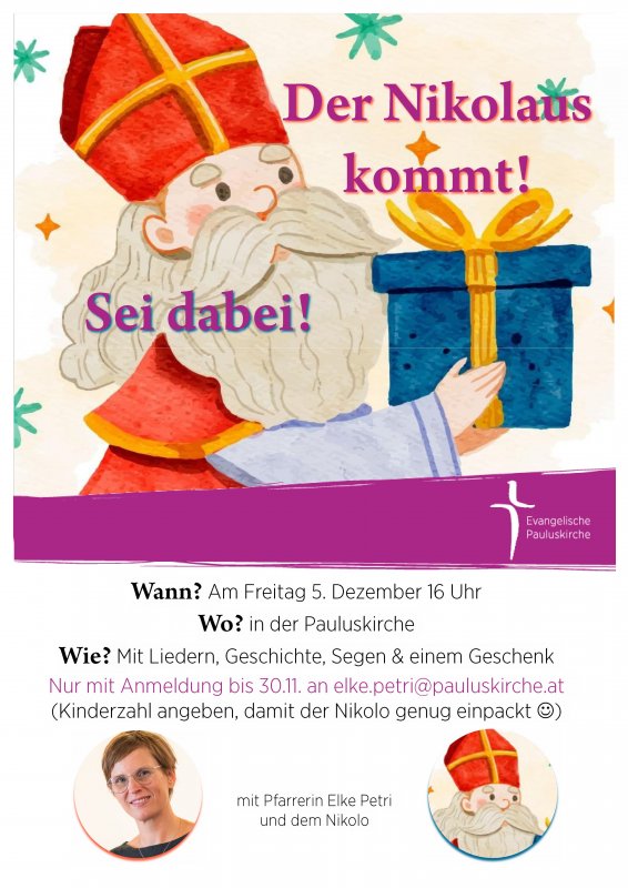 Der Nikolaus kommt! Bitte anmelden!05. Dez 2025 von pauluskirche Weitere Artikel ‹ Sing! Sing! Advent und Weihnachten in der Pauluskirche ›