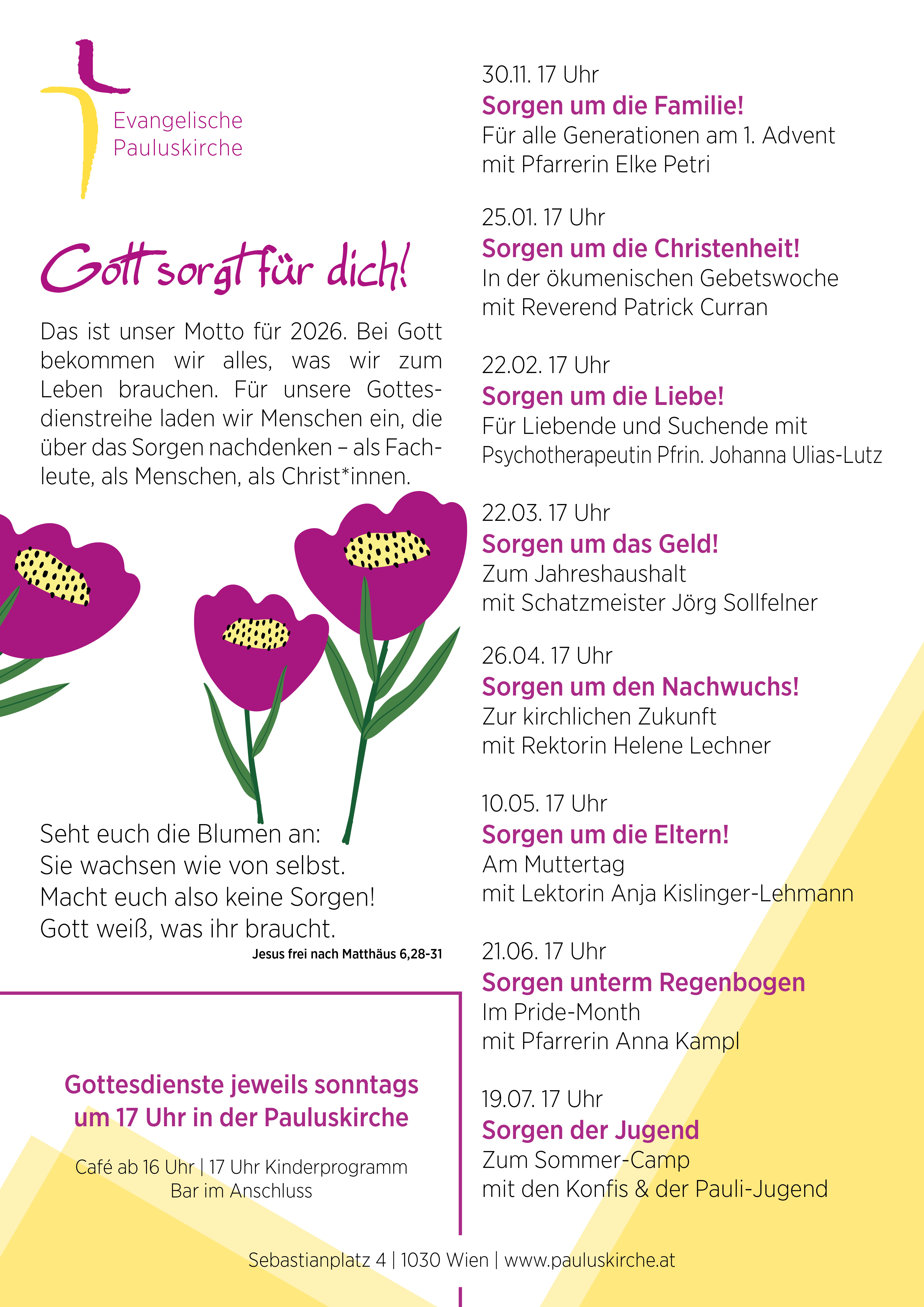 Unser neues Jahresmotto wird aber nicht nur die Lebensfeste, die Osterkerzen und Geburtstagspost prägen, sondern wir starten wieder eine passende Gottesdienstreihe und laden Menschen ein, die über das Sorgen nachdenken – als Fachleute, als Menschen, als Christ*innen.